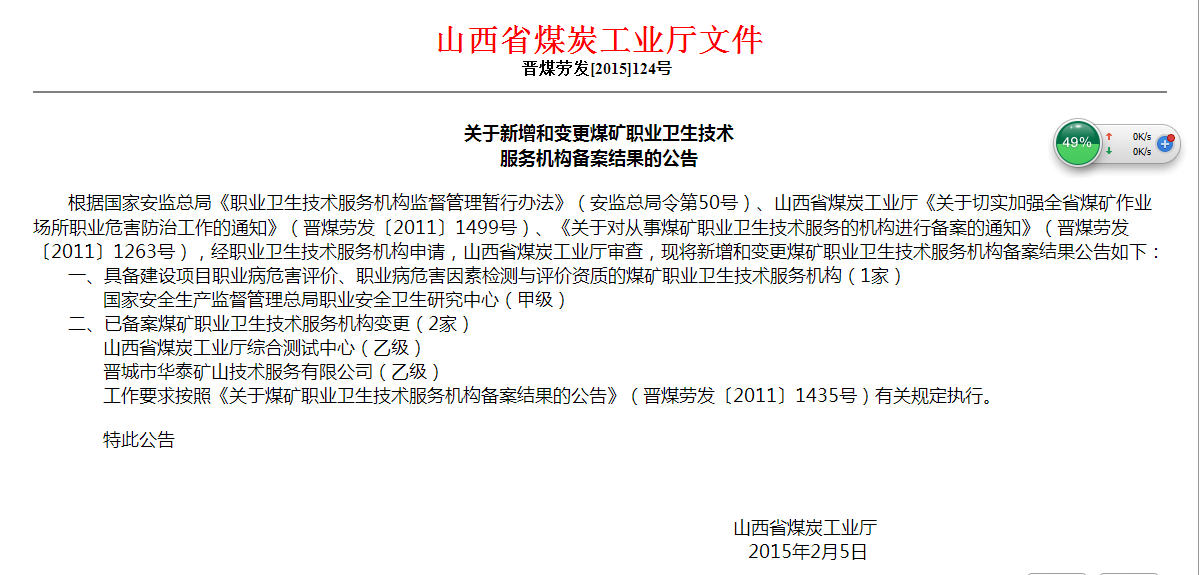晉城國投華泰科技有限公司(以下簡(jiǎn)稱華泰公司)是一家經(jīng)營性國有企業(yè),注冊(cè)資金1000.2萬元(由晉城市華泰礦山技術(shù)服務(wù)有限公司和晉城澤泰安全技術(shù)服務(wù)有限公司合并整合組建,國投全資)。公司持有山西省衛(wèi)生健康委員會(huì)頒發(fā)的《職業(yè)衛(wèi)生技術(shù)服務(wù)資質(zhì)證書》、山西省應(yīng)急管理局頒發(fā)的《安全評(píng)價(jià)機(jī)構(gòu)資質(zhì)證書》和山西省市場(chǎng)監(jiān)督管理局頒發(fā)的《檢驗(yàn)檢測(cè)機(jī)構(gòu)資質(zhì)認(rèn)定證書》等資質(zhì),設(shè)施設(shè)備、能力、資質(zhì)配套齊全。...【詳細(xì)信息】